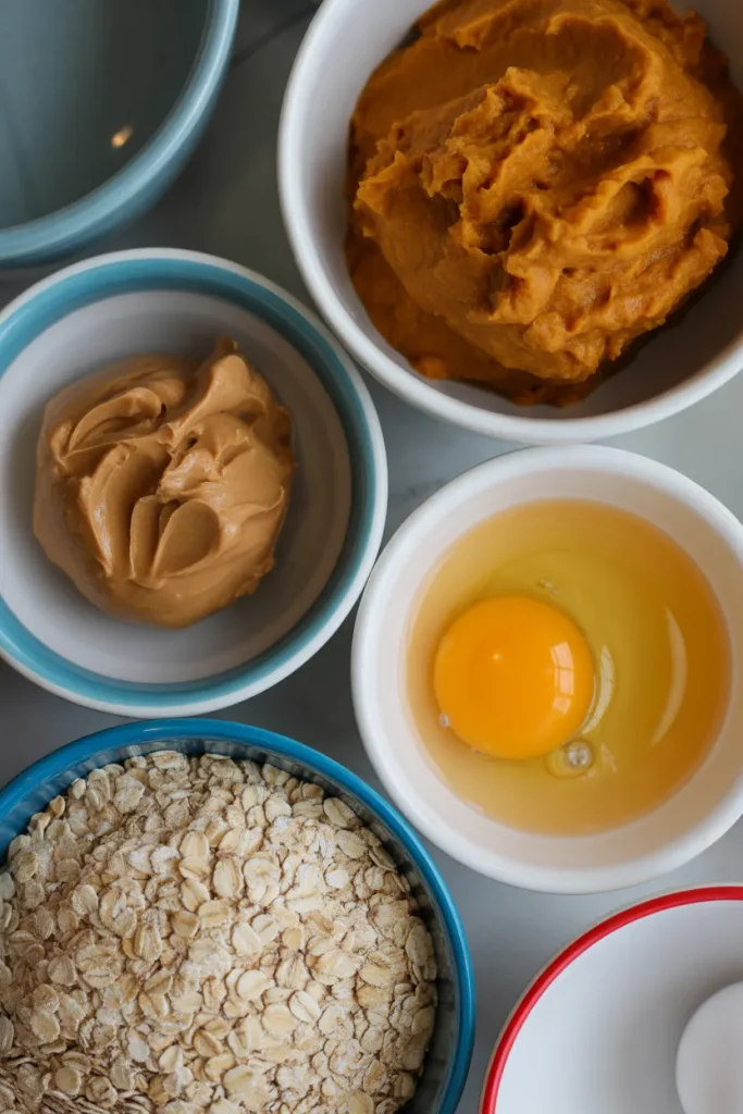 - 4 ingredients: peanut butter, pumpkin, oats, egg