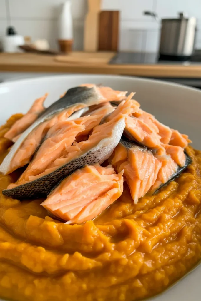Once cooked, I let the salmon cool slightly before handling it. Then I use a fork to break it into small, bite-sized pieces. This step is important for safety and easy mixing.