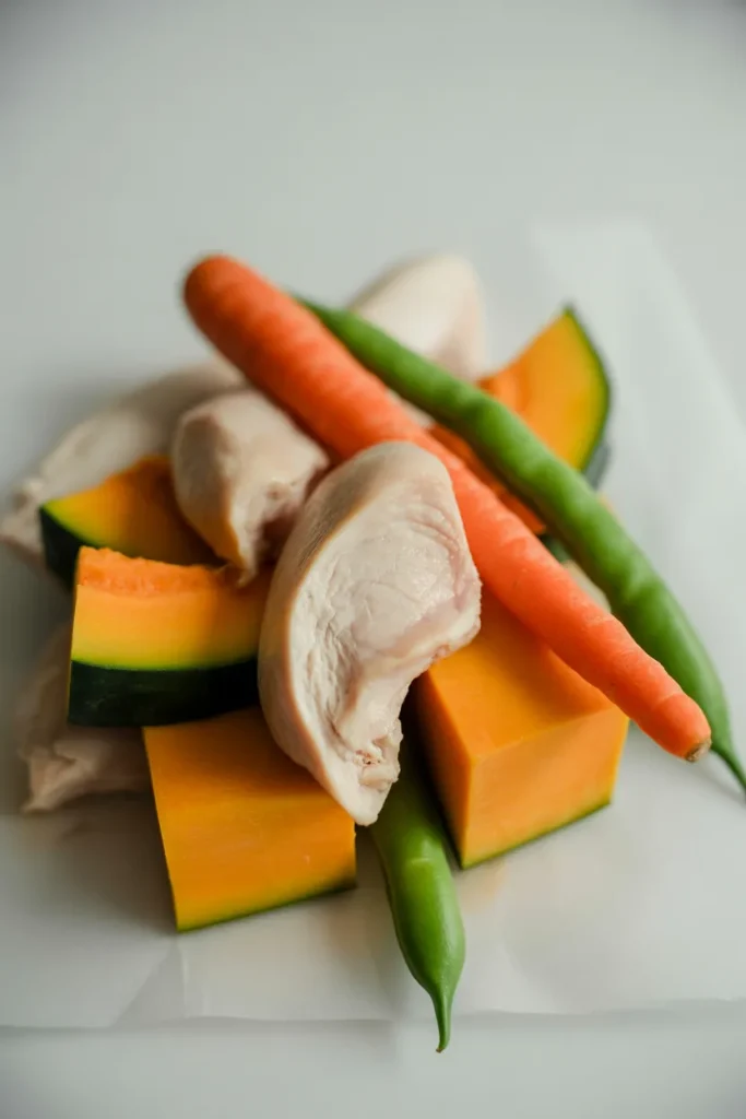 I stick to simple and accessible ingredients that are easy to find and prepare at home. Chicken serves as the main protein source, while pumpkin and rice build the base of the meal. Fresh vegetables help add nutrients without making the recipe too heavy.