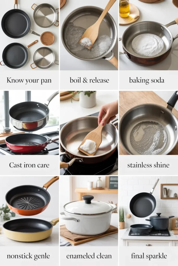 Above all, the key idea is simple: use the right method, avoid harsh mistakes, and clean pans early before buildup gets worse.