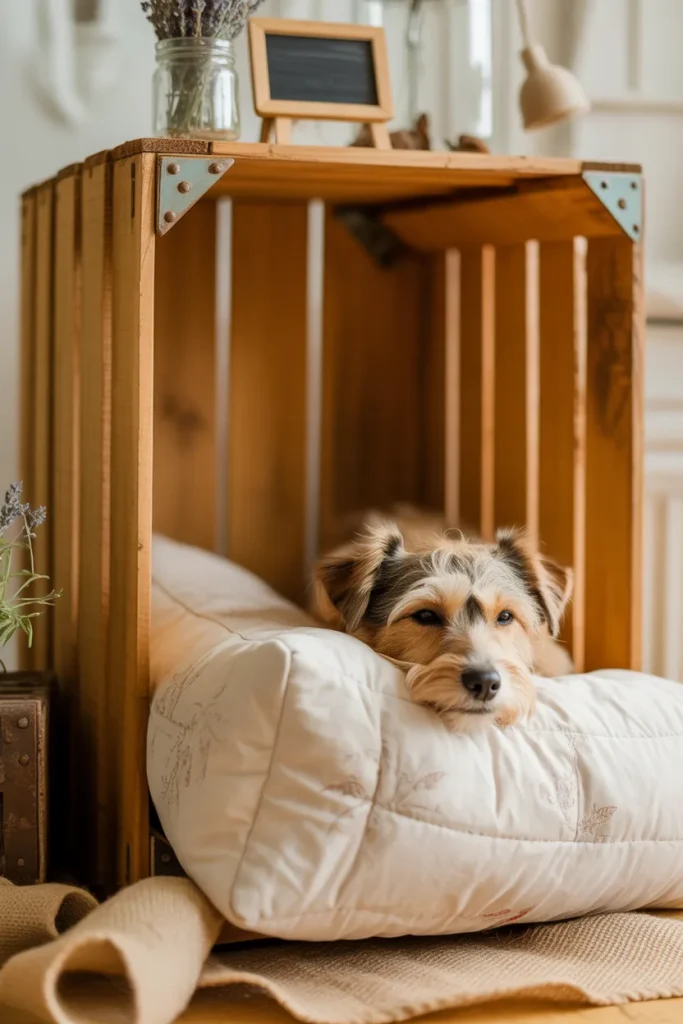 I reused a wooden crate to create a simple dog house. It’s affordable and easy to customize.