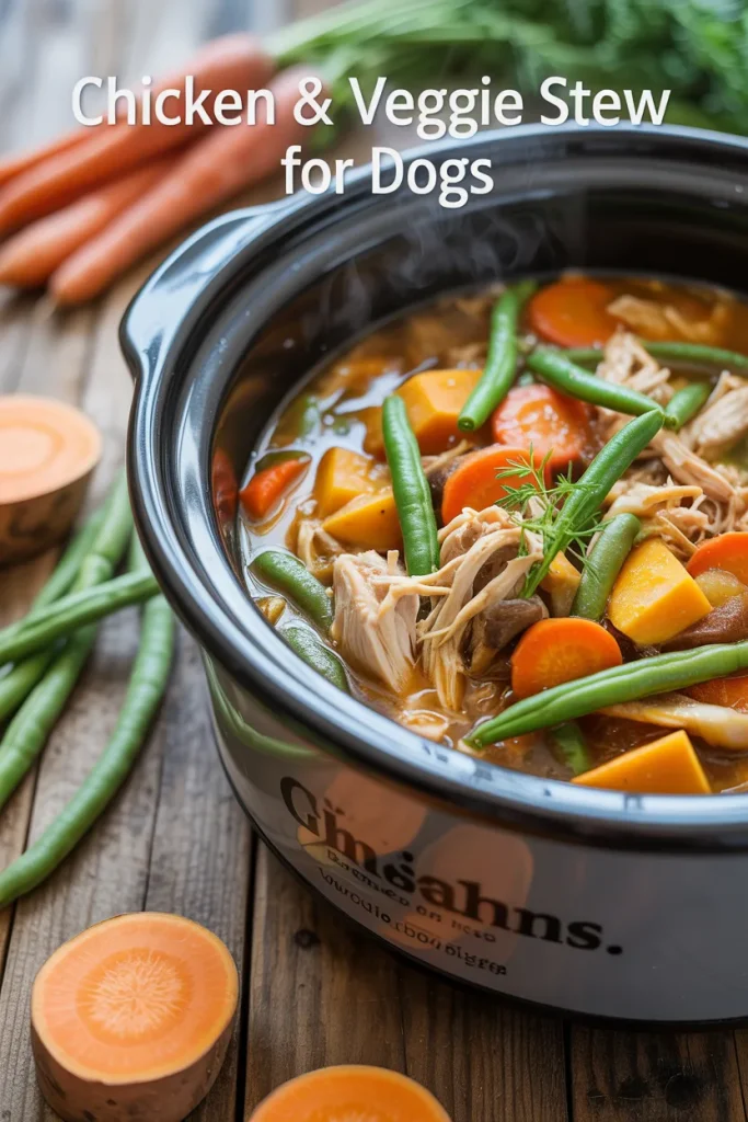 I use boneless chicken because it cooks evenly and is easy to shred. Sweet potatoes add slow-digesting carbohydrates, while carrots and green beans provide fiber and vitamins A and C.
