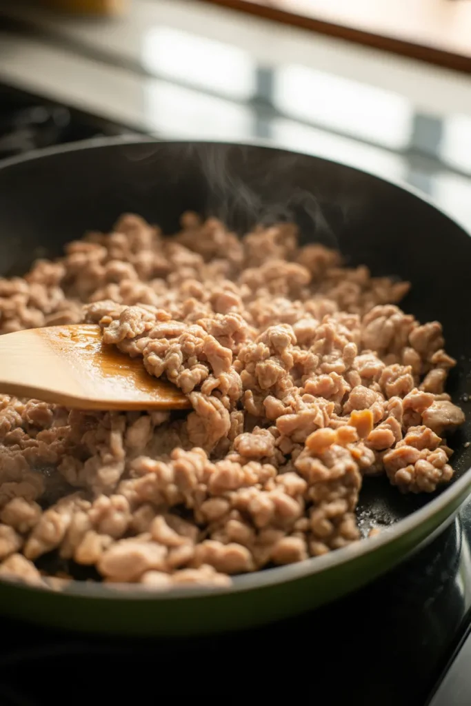 I start by cooking the ground turkey in a pan over medium heat. I break it into small pieces as it cooks and make sure I don’t add any oil or spices.