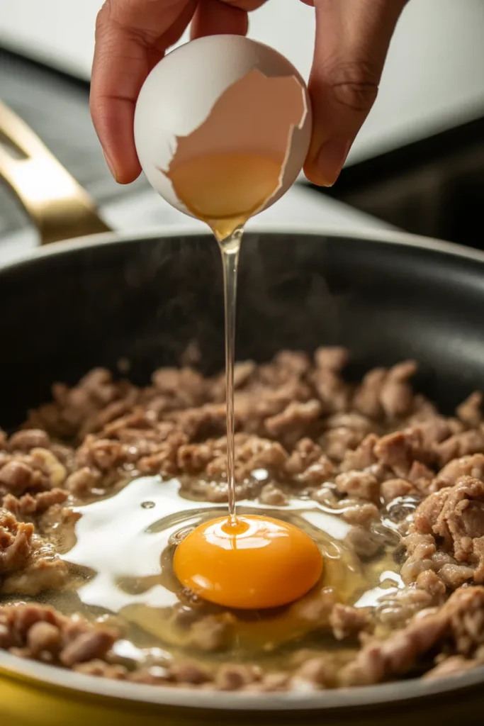 When the turkey is almost fully cooked, I add the egg directly into the pan. I stir it continuously so it cooks evenly and blends with the meat.
