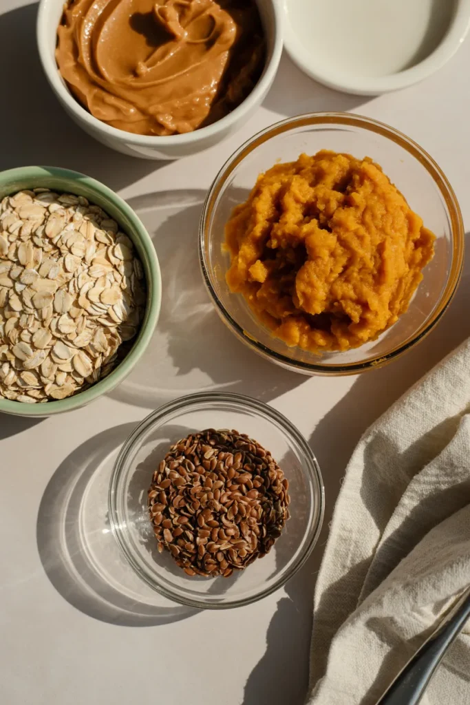 First, I mix peanut butter pumpkin (or applesauce), and flaxseed until smooth. This creates a thick base that holds everything together.