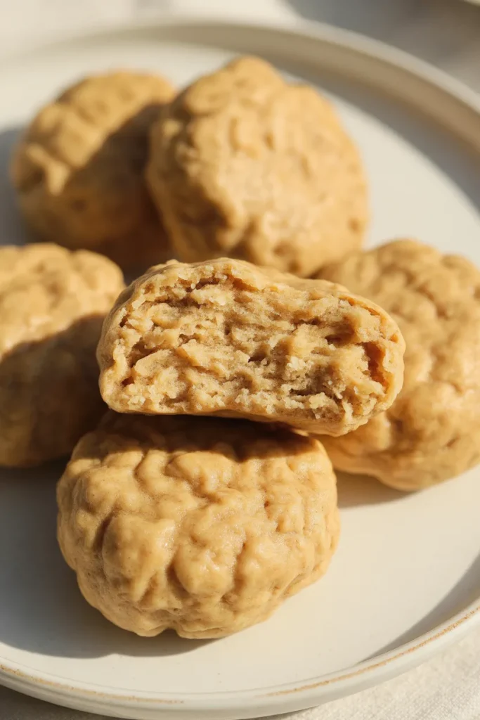 I mix peanut butter, pumpkin puree, egg, and applesauce, then combine with oat flour to form a soft dough. I roll and bake them until just set so they stay pillowy instead of crunchy.