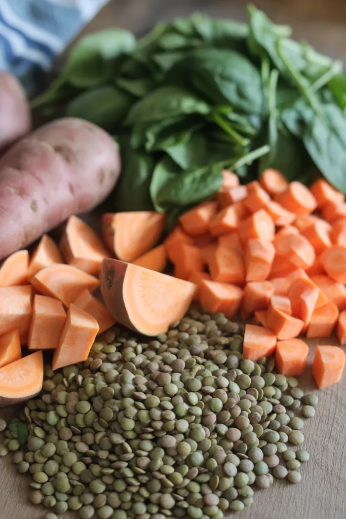 I wash and chop sweet potatoes, carrots, and spinach. If lentils are not pre-cooked, I rinse and boil them first.