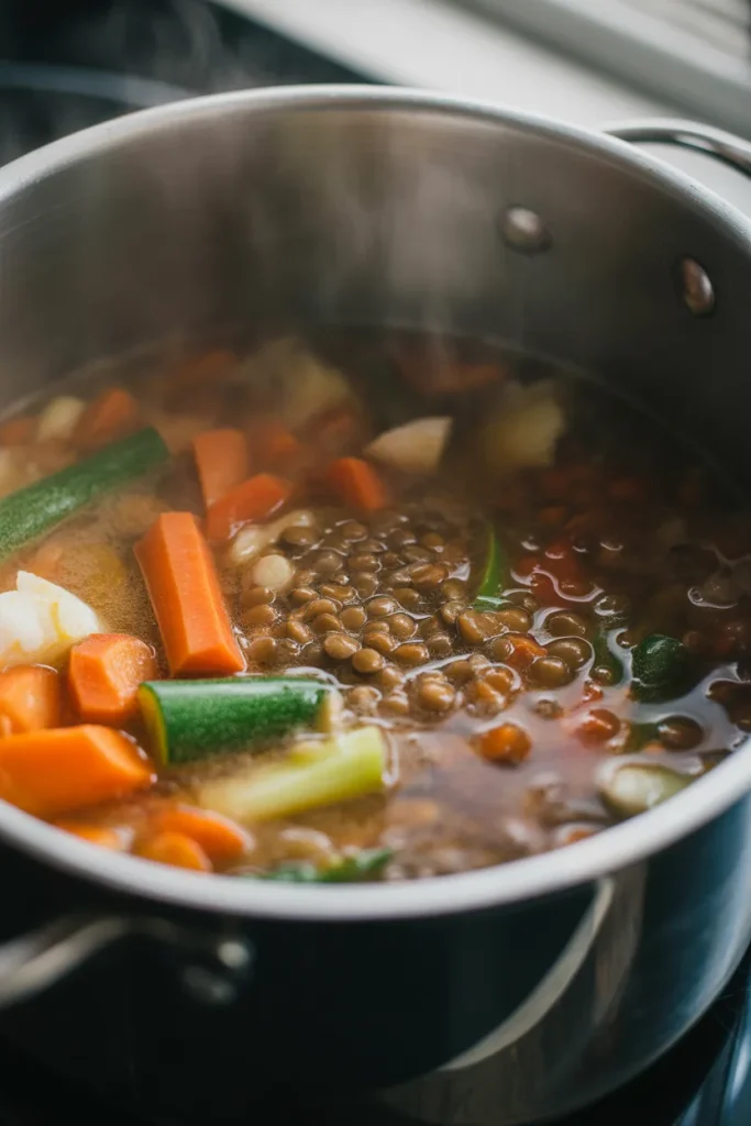 I add lentils, sweet potatoes, and carrots into a pot with water. Then I simmer everything for about 15–20 minutes until soft.